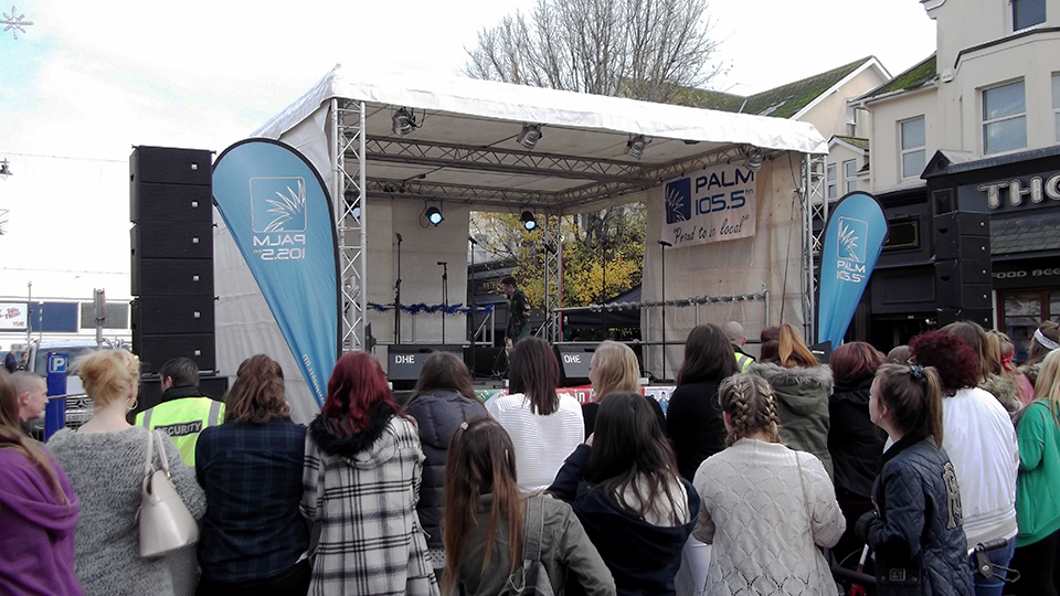 The stage area is 16ft x 16ft (4.8m x 4.8m). It is made from eight (8) 8ft x 4ft decks.